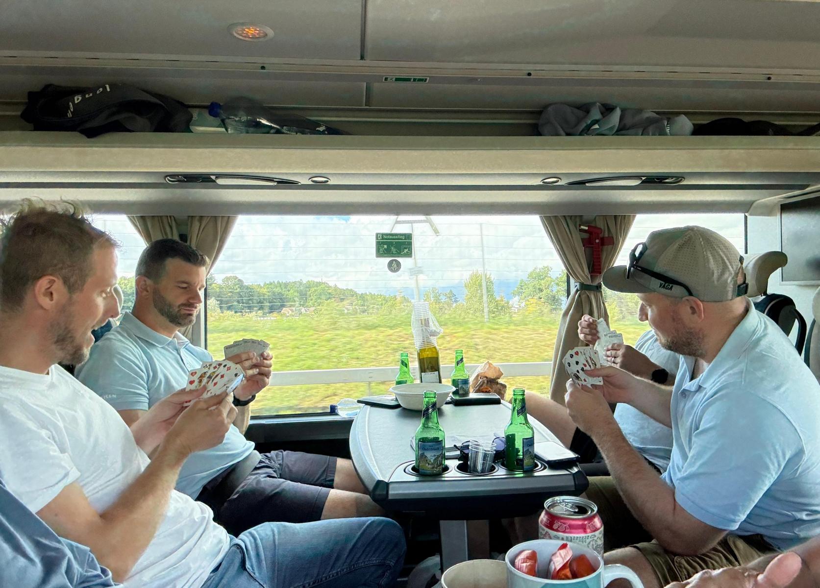 Im Car herrschte schon bald Feststimmung. Nur einer kam kaum zum Verschnaufen: Keve. Er wollte diverse Infos loswerden und allerhand von uns wissen – allgemeine Reiseinformationen, Rangverkündigung des Quiz, Essensbestellung inkl. Regeln und zum Schluss musste jede/jeder abstimmen, welche Aktivitäten er/sie am Samstag buchen möchte! Kurz gesagt: Dr Keve schnurred eifach z’vöu ;-). Nach sechs Stunden Fahrt und kurzem Hotelhalt marschierten wir noch flott 20 Minuten zum Brauhaus Schönbuch, wo wir uns das erste Abendessen schmecken liessen.